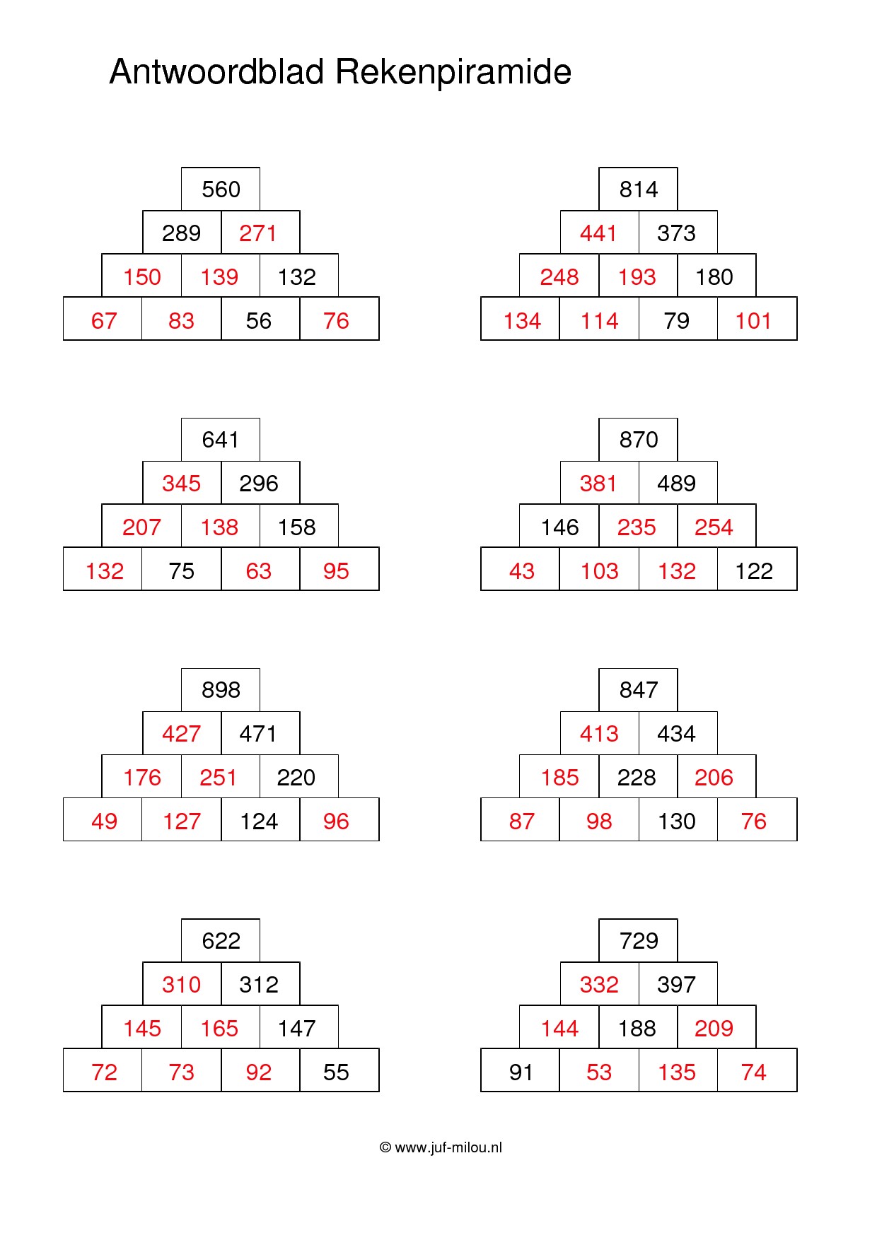 10 werkbladen met rekenpiramides en elk werkblad heeft 8 piramides. Bij elk werkblad zit ook een antwoordblad.